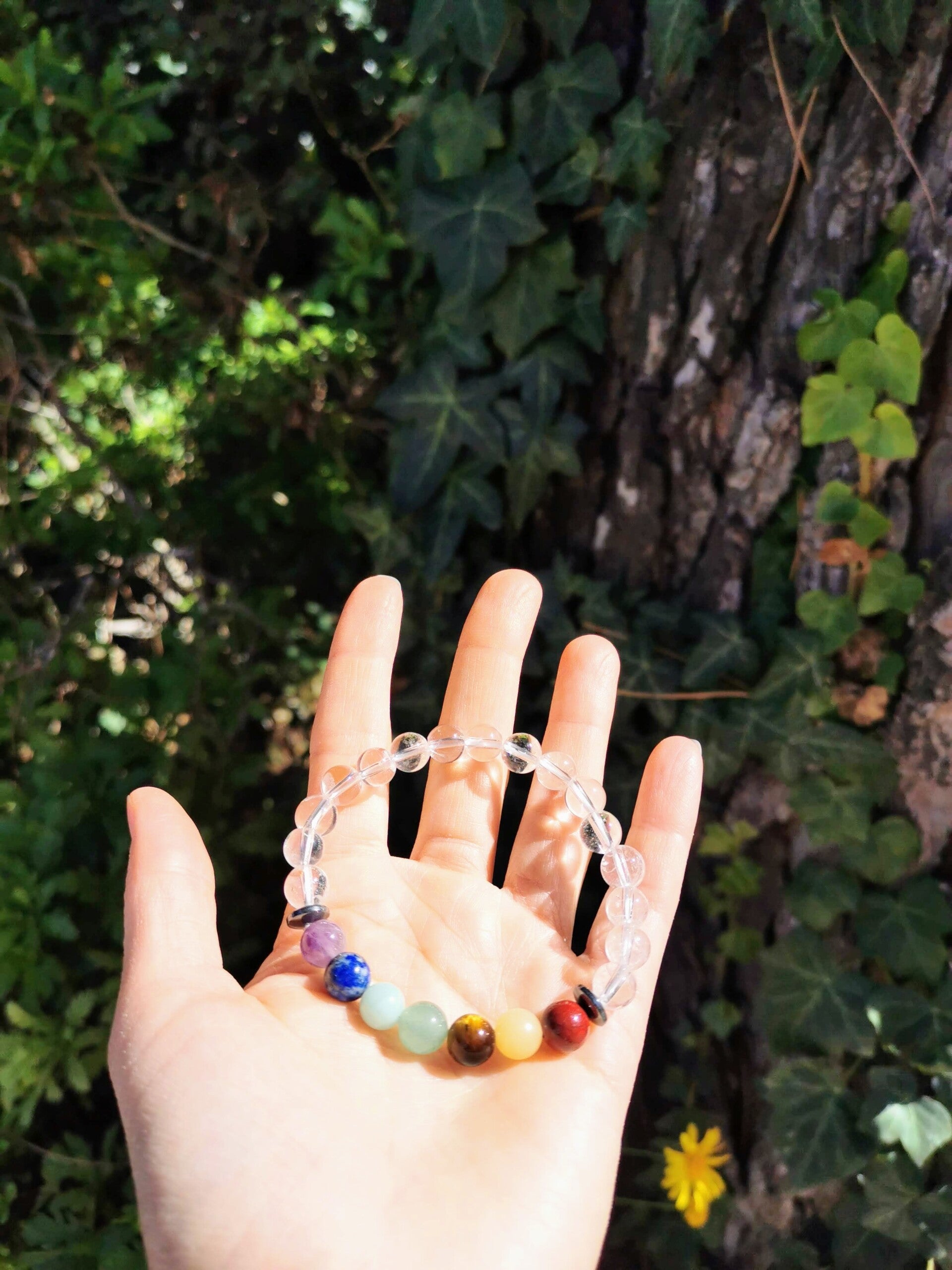 Pierres : Jaspe rouge / Calcite Orange / Œil de Tigre / Aventurine Verte / Amazonite / Lapis Lazuli / Améthyste / Cristal de Roche